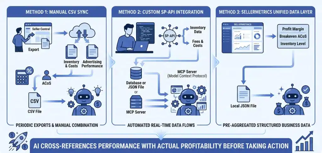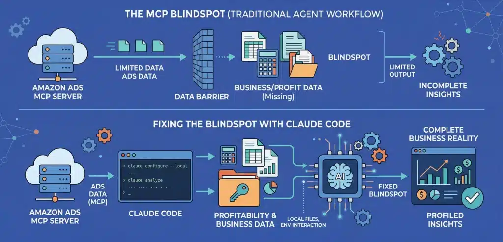 The MCP blindspot exists because the Amazon Ads MCP server only has access to advertising data. It cannot see your inventory, FBA fees, or product costs from the Selling Partner API.