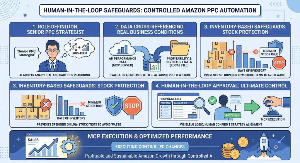 Not at all. The smartest automation strategy utilizes a “human-in-the-loop” safeguard. You can instruct the AI to do the heavy lifting of data analysis and output a structured execution proposal, allowing you to manually review and approve the bid changes before they are pushed live to Amazon.