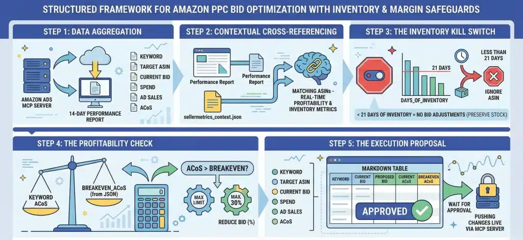 “Do not execute any API calls to update the bids yet. Output a highly readable markdown table showing the keyword, Target ASIN, Current Bid, Proposed Bid, Current ACoS, and the Breakeven ACoS used for your calculation. Wait for my explicit command of ‘APPROVED’ before using the MCP server to push these bid changes live to Amazon.”