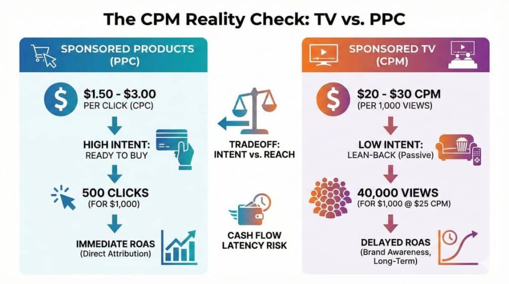 The biggest shock for sellers moving from Sponsored Products to Sponsored TV is the pricing model. You stop paying for Clicks (CPC) and start paying for Impressions (CPM – Cost Per Mille, or 1,000 views).