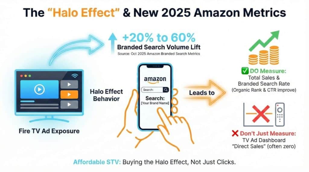 This is the key to making STV “affordable.” You are buying the Halo Effect. When a customer sees your ad on Fire TV, they rarely pick up the remote and click “Buy.” Instead, they pick up their phone and open the Amazon App. They search for your brand name.