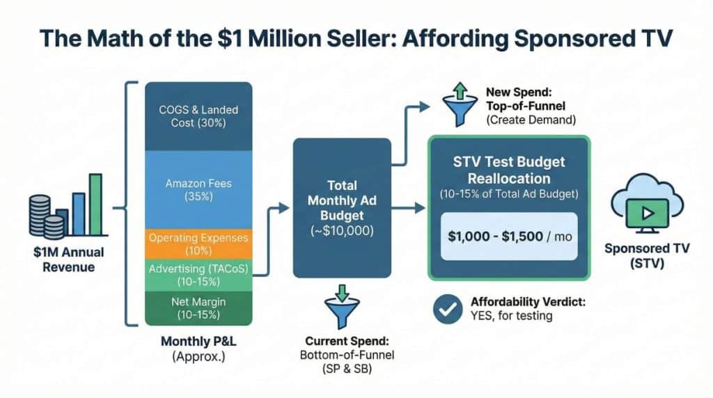 For a $1M seller, the “sweet spot” for a Sponsored TV test is 10% to 15% of your total ad budget. That means allocating $1,000 to $1,500 per month. This buys you entry. But does it buy you sales? That depends on the CPM.