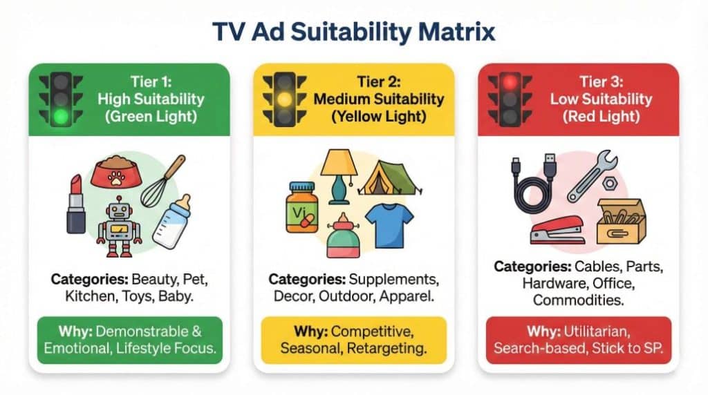 Do not run Sponsored TV if you are low on stock. The “Halo Effect” can drive a spike in traffic across your entire catalog. If you stock out, you waste the ad spend and hurt your organic rank simultaneously.