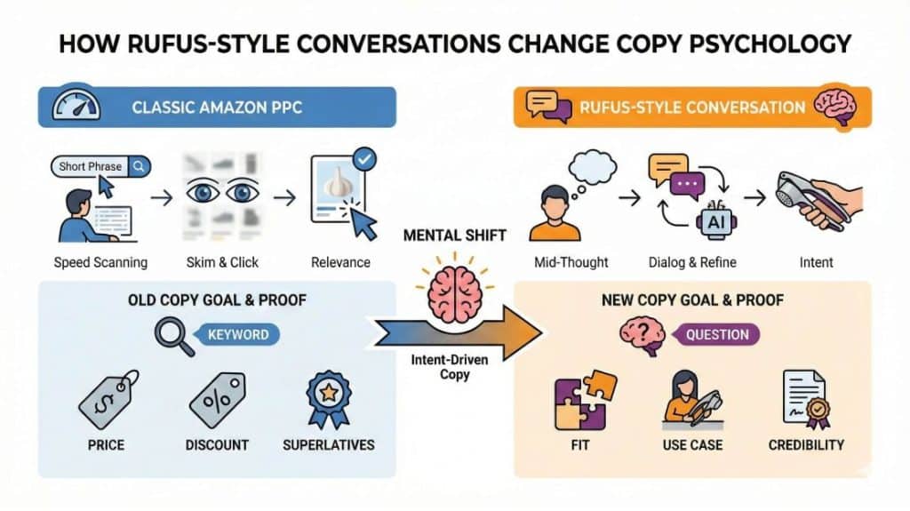 Classic Amazon PPC assumes speed scanning. A shopper types a short phrase, skims, clicks, and you win by being the most relevant click.