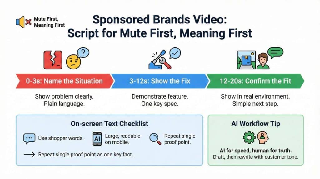 Video is where many brands accidentally go silent. Sponsored Brands video plays automatically and starts without audio by default, so captions and on-screen text are not optional if you want the message to land. Amazon also recommends making a strong first impression in the first few seconds and keeping the video brief and easy to understand. That lines up perfectly with conversational shopping, because a shopper’s question tends to have a tight “why” behind it.