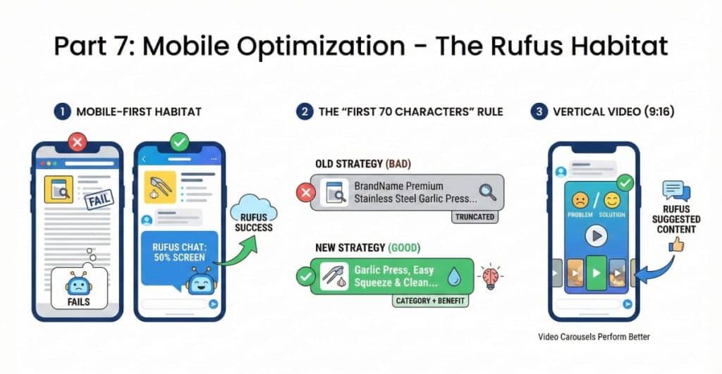 Rufus responses often include video carousels. Vertical videos (9:16 aspect ratio) perform significantly better in the mobile chat stream than horizontal ones. Ensure your listing has at least one vertical video demonstrating the “Problem/Solution” arc. This video is more likely to be pulled into a Rufus “suggested content” bubble.