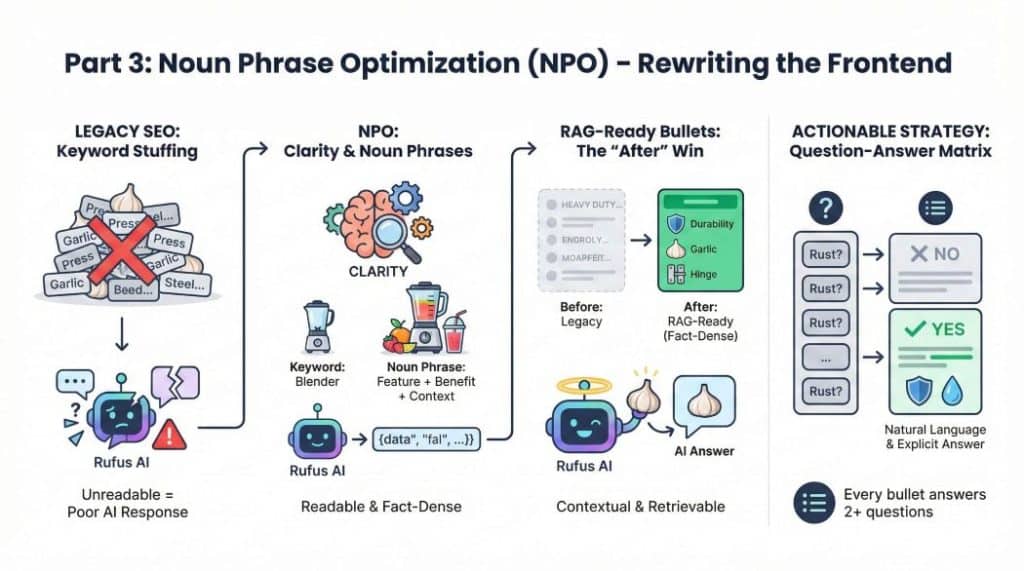 The Bullet Point Overhaul: You need to rewrite your bullets to be “RAG-Ready.” This means they should be grammatically correct, fact-dense sentences that can be easily “lifted” by the AI to answer a question. Think of each bullet as a ready-made answer Rufus can quote.