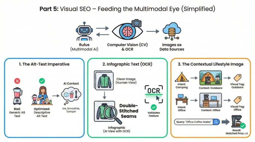 We often forget that Rufus is multimodal. It “sees” your images using Computer Vision (CV) and OCR (Optical Character Recognition).