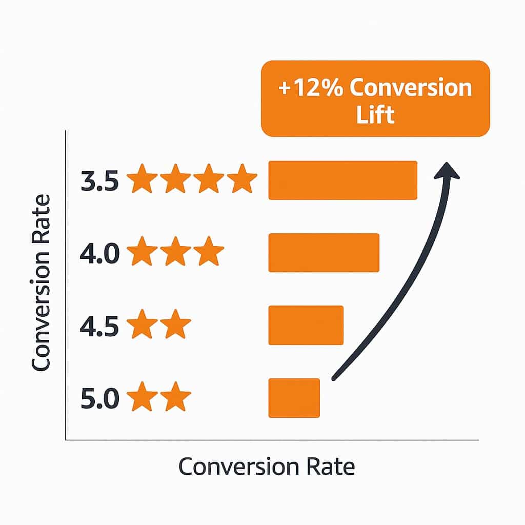 On Amazon, reviews are more than just social proof. They are the lifeblood that fuels your Amazon sales engine. A study conducted by Pattern indicates a significant increase in conversion rates for higher-rated products: improving a product's average rating from 3.5 to close to 5 can result in a 12% conversion rate lift. However, especially for new listing launches, many sellers face a chicken-and-egg paradox: to sell products, Amazon listings need user reviews, but getting user reviews depends on past sales. That’s where we at SellerMetrics can help. Our review management services help you reach the crucial goalpost of accumulating a critical number of reviews required to accelerate the Amazon flywheel and pave the way to self-sustained sales. Some interesting stats on this: listings with 50+ reviews convert 4.6× higher than those with fewer than 10 ratings.