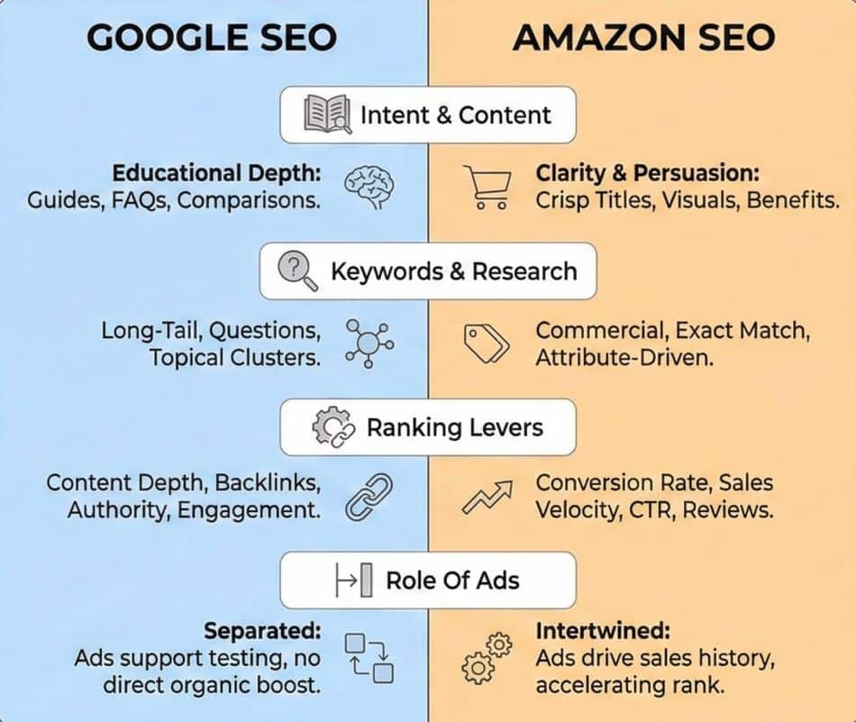Google prioritizes authority and helpfulness (backlinks, E-E-A-T). Amazon prioritizes profitability (sales velocity, conversion rate, and price competitiveness).