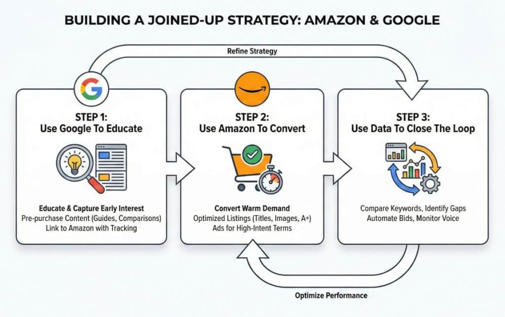 Focus your Google presence on helpful, authoritative content that earns links and builds your brand. Focus your Amazon presence on high-converting listings, clean account health, strategic Amazon search term optimization, and a tight integration between Amazon SEO and PPC. Use each platform for what it does best, and let them feed traffic and trust into each other.