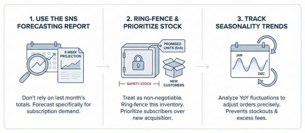 Never rely solely on past sales history. Use the “Subscribe & Save Forecasting” report to view projected demand for the next eight weeks. You must “ring-fence” this inventory mentally—treating it as already sold—to ensure you never prioritize new customers over loyal subscribers.