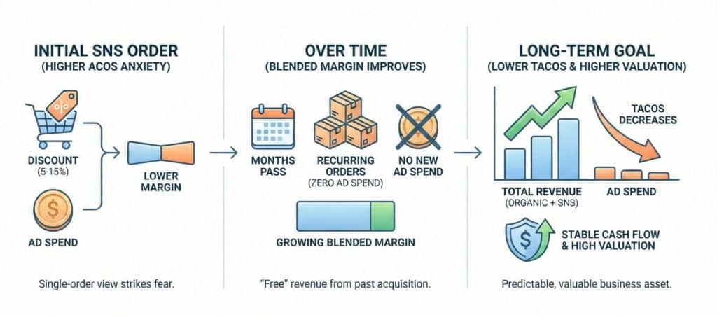 Why does TACoS decrease? Because those recurring orders do not require new ad spend to generate. They are “free” revenue in the sense that you already paid for the customer months ago. A healthy SnS program will initially look like a drain on margins because you are acquiring customers. But fast forward six months, and that cohort of subscribers is generating revenue every month with zero ad spend. This depresses your TACoS and increases your overall business valuation. Buyers and aggregators love high SnS percentages because it represents stable, predictable cash flow. It reduces the risk profile of the business.