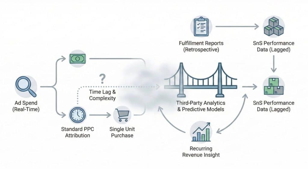 The primary challenge with SnS tracking is that Amazon’s default advertising reports do not explicitly tell you, “Campaign A generated 5 new subscriptions today.” The attribution window for Subscribe & Save is longer and more complex than standard attribution. A customer might click your ad today, buy a single unit to test it, and then come back three weeks later to subscribe. Standard PPC attribution might miss this second event entirely, or attribute it to organic traffic. None of these reports are wrong, but they rarely line up in a way that feels immediately usable.