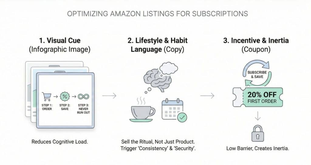 This goes beyond the default Amazon radio button. You need to use your images and your copy to sell the “lifestyle” of the subscription. Your image stack is prime real estate. One of your secondary images should explicitly explain the benefits of subscribing. Do not assume the customer knows how it works. Use an infographic that shows “Step 1: Order, Step 2: Save 15%, Step 3: Never run out.” This visual cue validates the decision to subscribe. It reduces the cognitive load on the buyer and makes the subscription feel like a savvy financial hack rather than a burden.