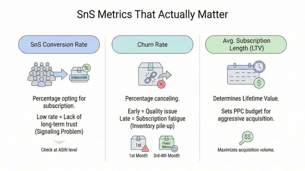 When you open your SnS performance reports, you will be greeted with a wall of numbers. To avoid analysis paralysis, you need to focus on three core metrics: The Conversion Rate, The Churn Rate, and The Average Subscription Length. Individually, each metric looks simple. Together, they explain why surface-level optimization often misleads.