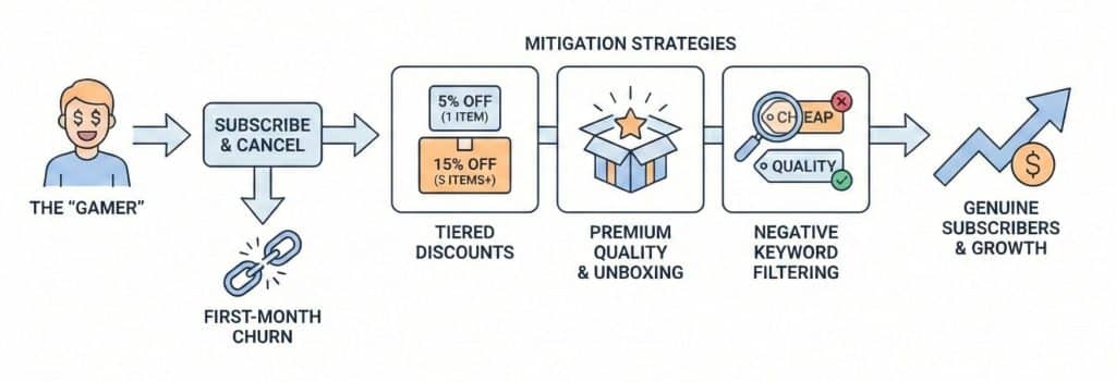 While you cannot completely eliminate this behavior, you can mitigate it. One way is to offer a modest discount for the subscription (e.g., 5%) but a larger tiered discount if they subscribe to multiple items (e.g., 15% for 5 items). This raises the bar for the “gamer” and encourages genuine bulk buyers.