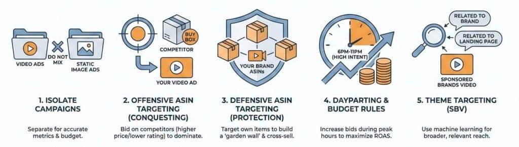 Use third-party PPC software or Amazon’s native budget rules to increase your video ad bids by 30% during high-intent evening hours. Then lower bids back to a maintenance level during early morning periods that convert less.