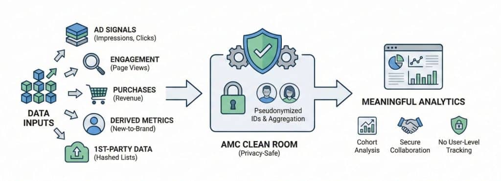 At its core, Amazon Marketing Cloud (AMC) for non-enterprise is a secure, cloud-based data clean room where you can run custom analytics across pseudonymized signals from Amazon Ads and your own first-party data. Amazon designed AMC to be privacy-safe, so you never see personally identifiable information, but you can analyze patterns, sequences, and cohorts at scale.