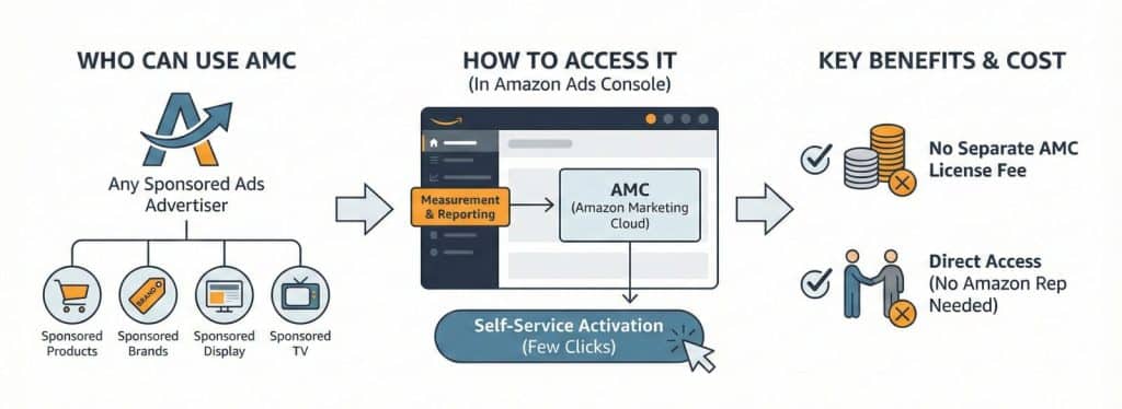 For non-enterprise sellers, this means you no longer need an Amazon representative or enterprise DSP agreement to get started. If you already invest in Sponsored Ads and meet the basic eligibility conditions, you can likely activate AMC directly.