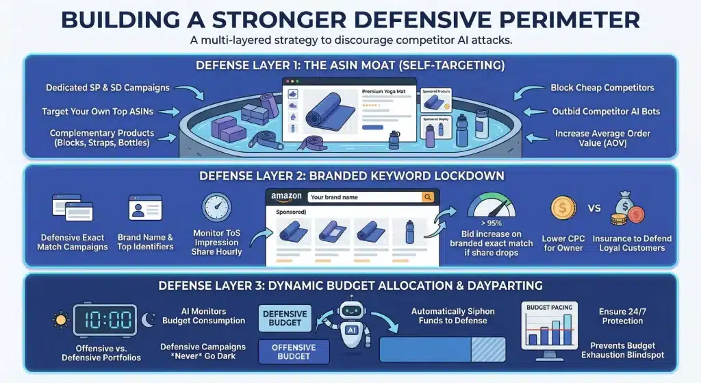 The Strategy: You cannot treat your defensive campaigns the same way you treat your offensive discovery campaigns. If your non-branded, generic keyword campaigns run out of budget at 5:00 PM, that is unfortunate but acceptable. If your Branded Keyword Lockdown or ASIN Moat campaigns run out of budget at 5:00 PM, competitors have a clearer opening to take those placements.