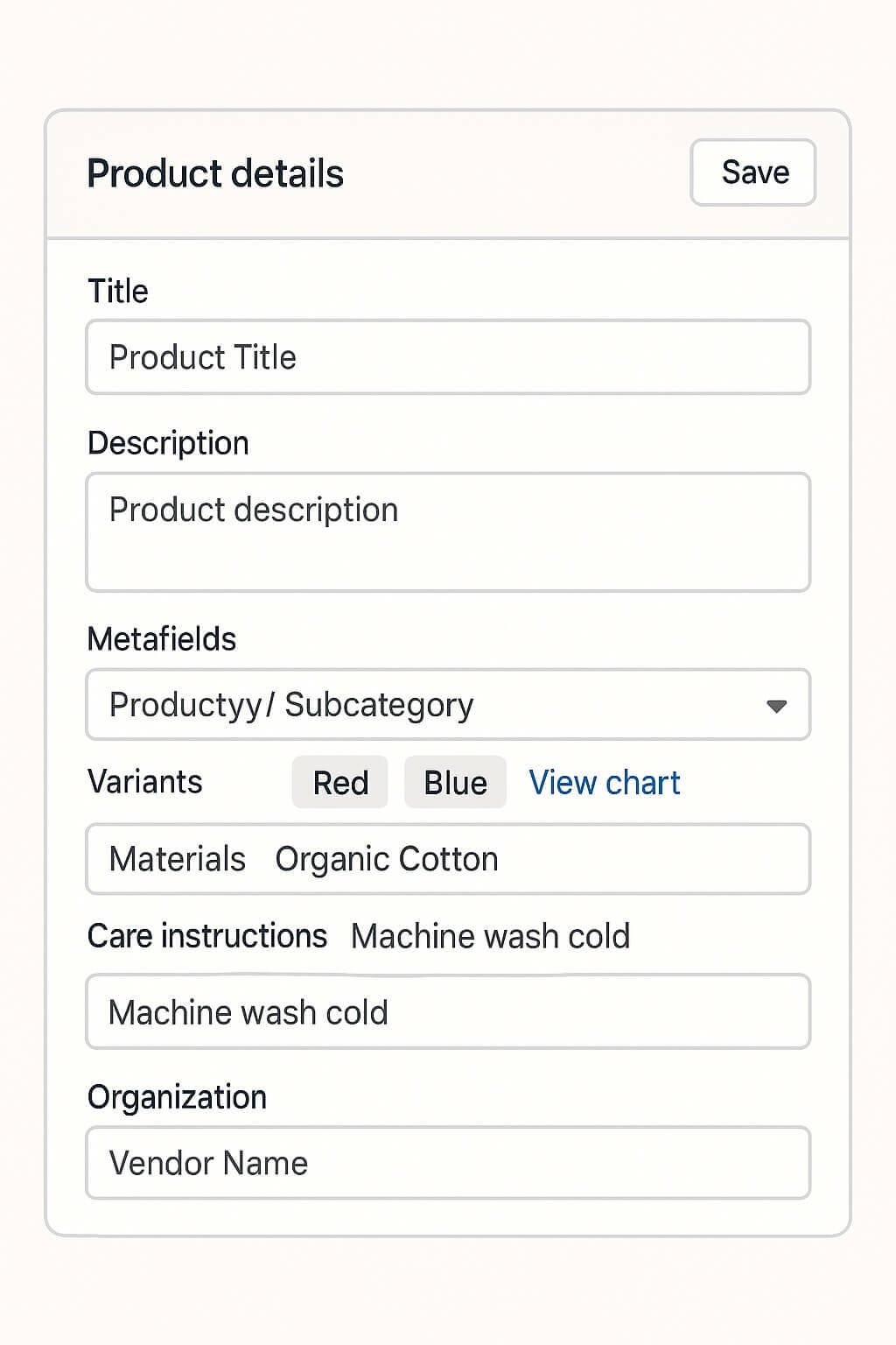 Each product should be enriched with attributes using metafields, ensuring that product details, including color names, material types, or size options are provided.