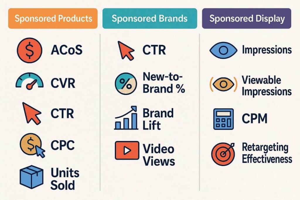 Each Amazon ad format serves distinct strategic goals, necessitating tailored KPIs: