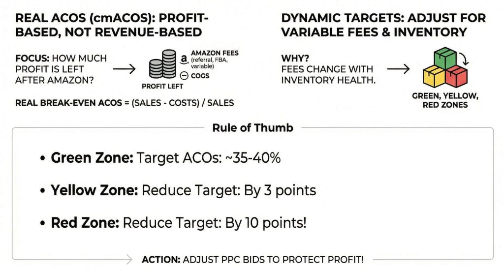 Real ACOS” targets Contribution Margin rather than just Revenue. You calculate your true break-even point by subtracting all variable fees (Inbound Placement, Returns, Low-Inventory) from the sales price before setting your target.