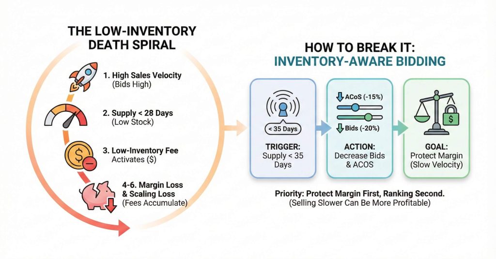 You must act immediately to avoid the “Death Spiral” of the $0.89/unit Low-Inventory Surcharge. If stock drops below 35 days, slash your bids and lower your target ACOS by 10 points to slow velocity and escape the fee.