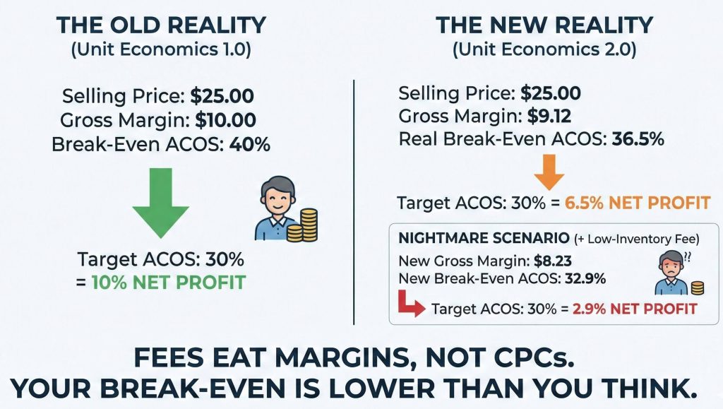 Your “healthy” ACOS relies on outdated math that ignores new 2026 variable fees like the “Logistics Tax” and “Low-Inventory Surcharges.” You are likely overspending because your actual margin is much thinner than what your dashboard displays.